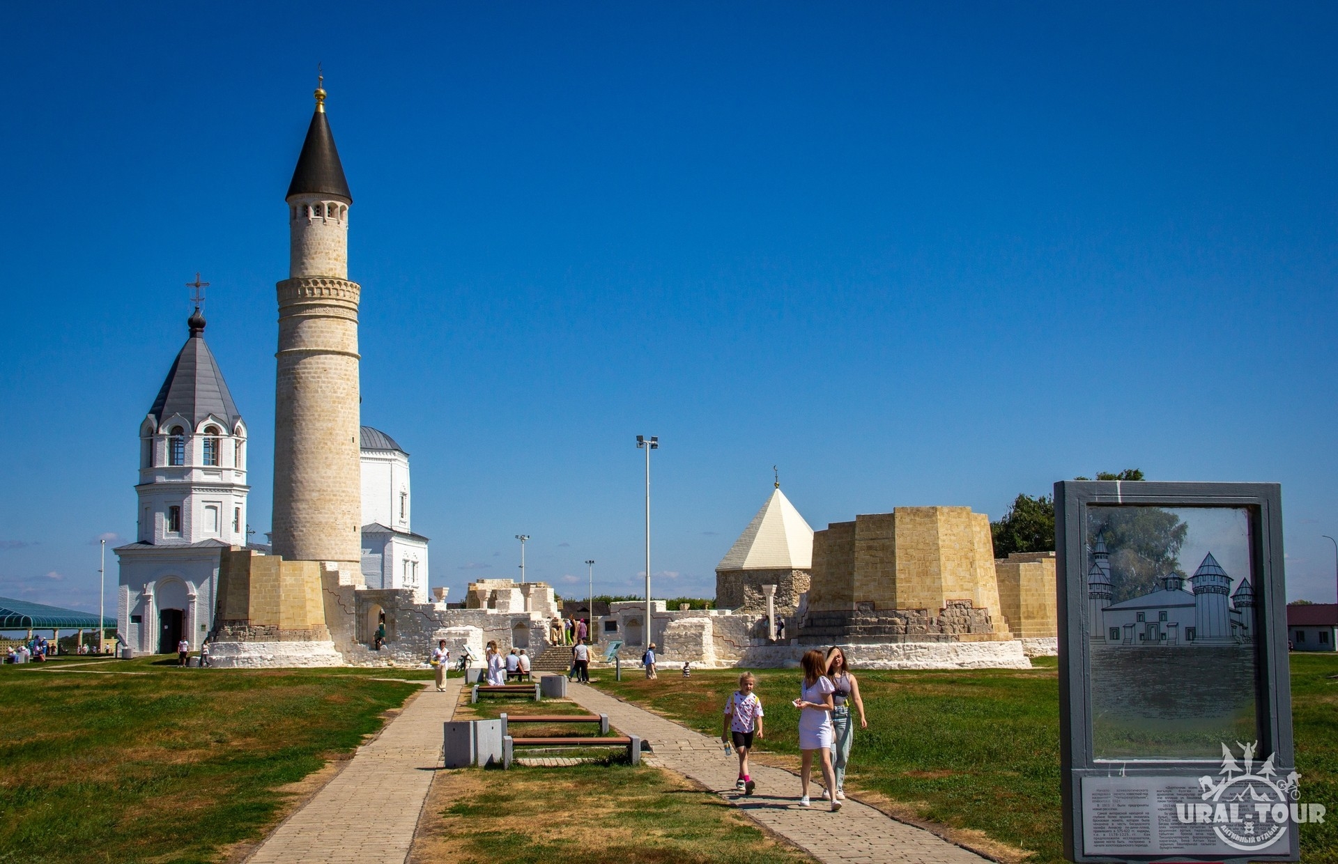 Вы увидите остатки средневековых оборонительных рвов и валов, архитектурные памятники булгарских и золотоордынских времен (13-14 вв.): Белую и Черную палаты, Большой и Малый минареты, Северный и Восточный мавзолеи, Ханский дворец, Соборную мечеть, Ханскую усыпальницу, «археопарк», посетите Музей болгарской цивилизации, «Памятный знак», где находится самый большой в мире печатный Коран, современную Белую мечеть и многое другое.